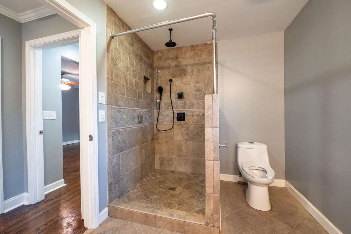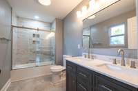 The Primary Suite boasts beautiful hardwood floors, two closets, and a spa- like en suite bathroom featuring new tile flooring, a double sink vanity with granite countertop and a luxurious glassed- in tile tub/ shower combo. On the other end of the home, you' ll find two additional bedrooms, one with a large walk- in closet, and both generously sized with hardwood flooring. These two bedrooms share a beautifully updated full bath with a walk- in tiled shower and double sink vanity with granite countertop.