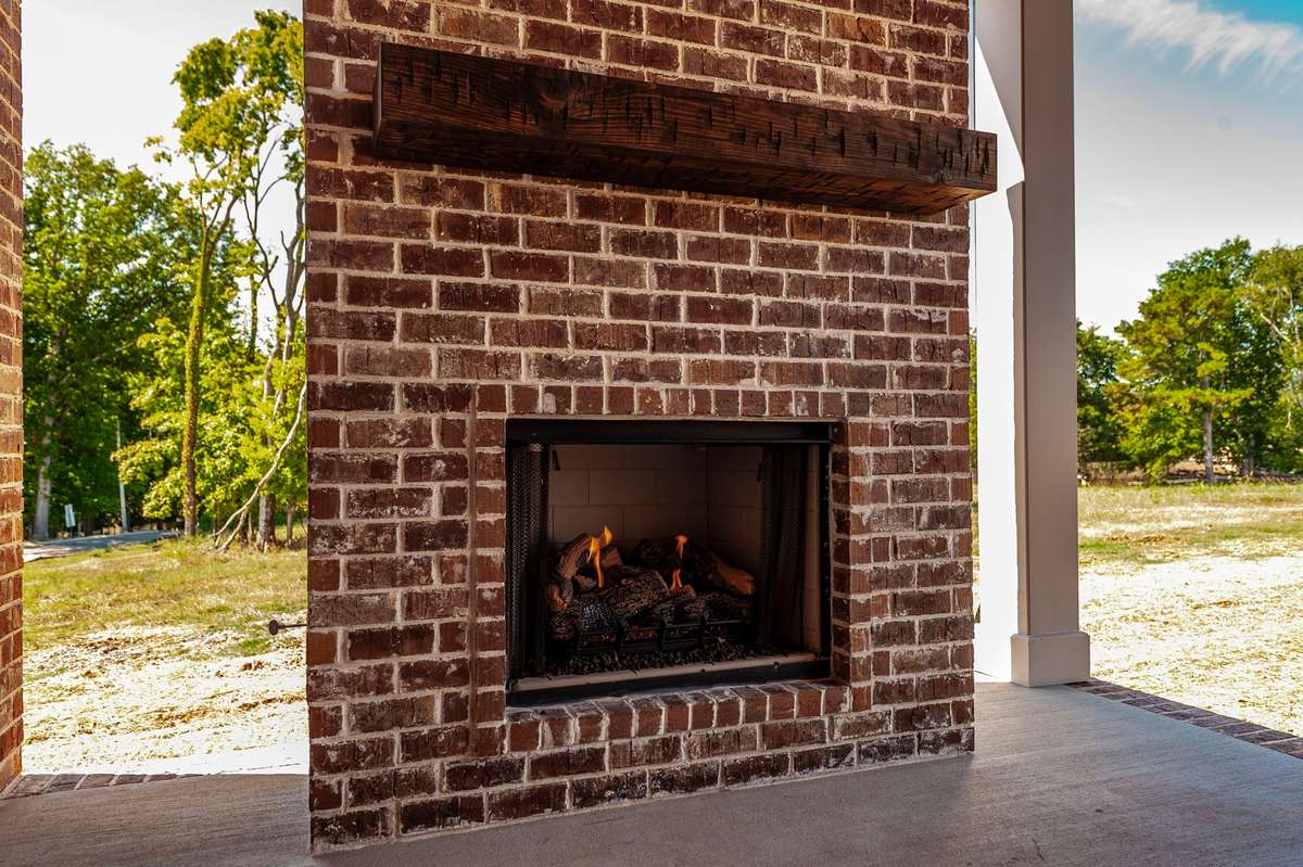 Outdoor living truly shines with the covered back patio, featuring a built- in outdoor fireplace and wood tongue- and- groove ceiling—perfect for year- round entertaining, cozy evenings, or relaxing in style.