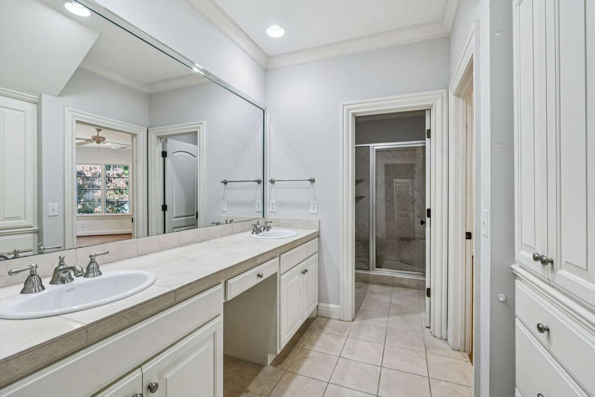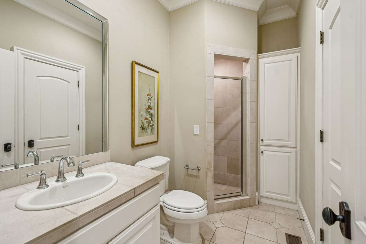 The main level features a true primary suite and an additional guest suite, while a second primary suite upstairs provides flexibility for multi- generational living. The sixth bedroom may serve as a gym, nursery, or hobby room. Refined finishes and abundant natural light create an inviting atmosphere throughout.