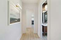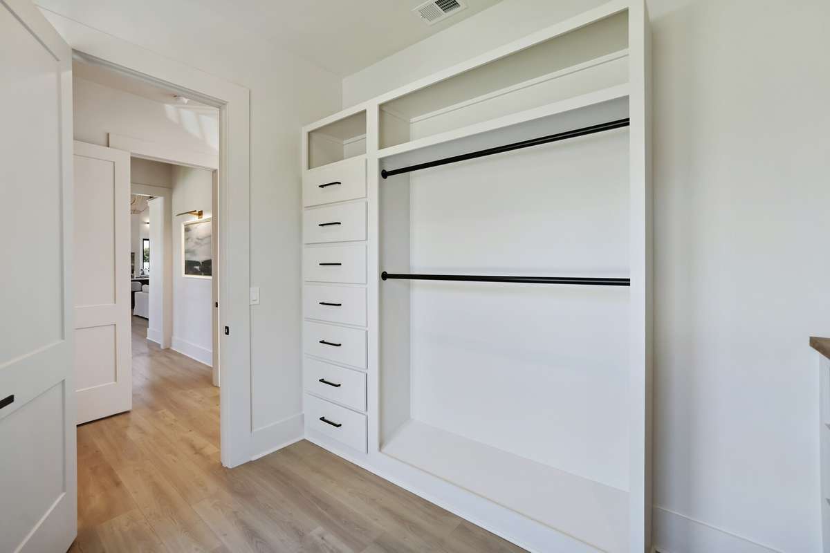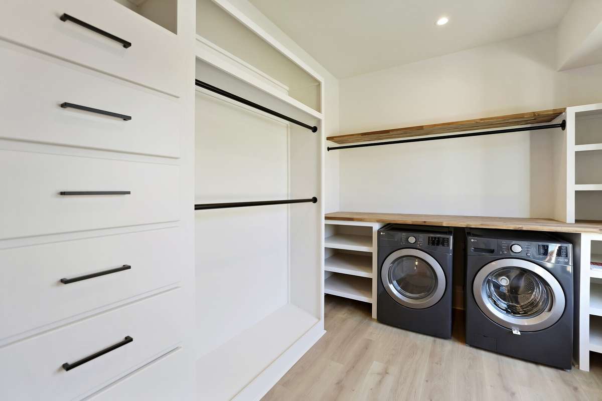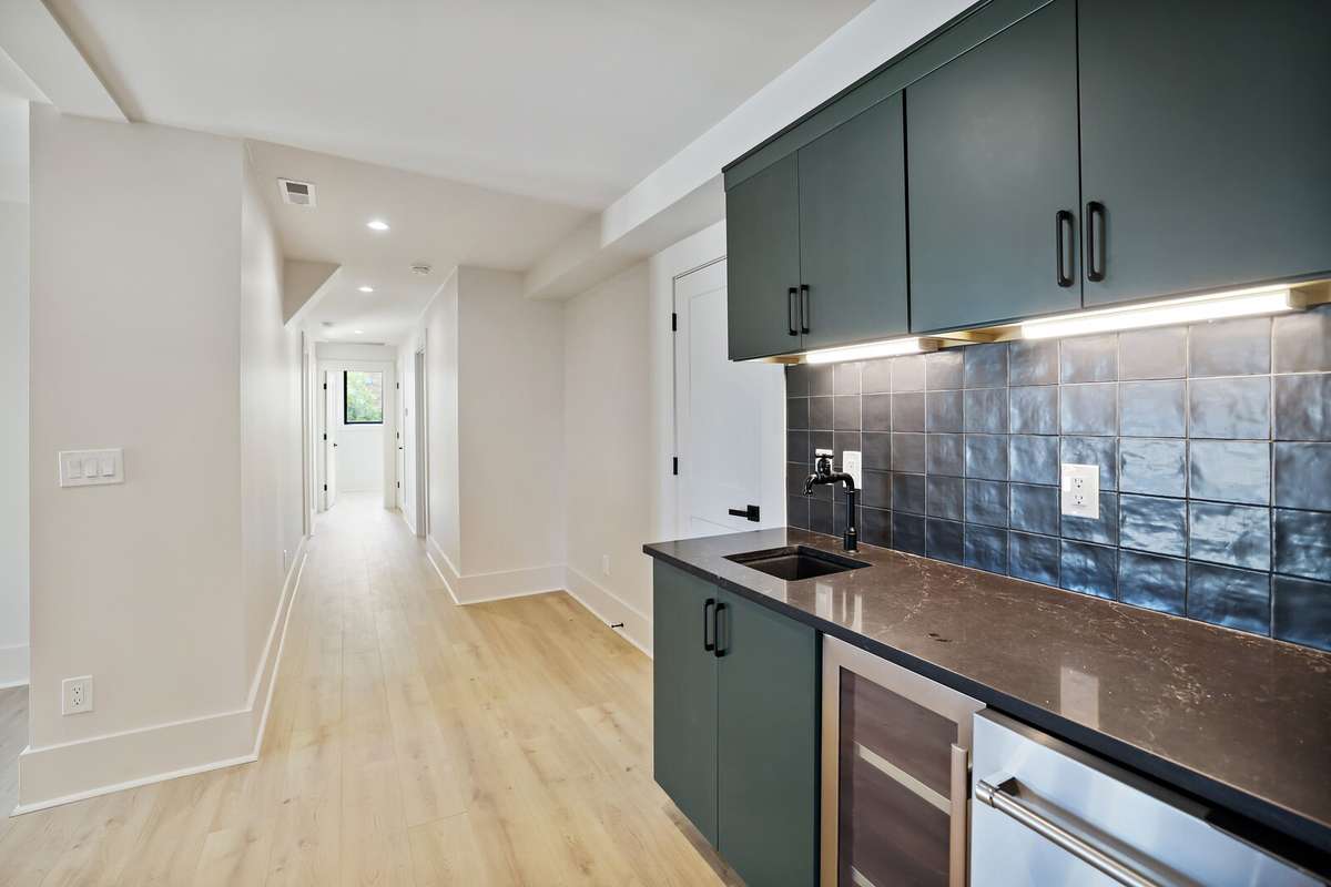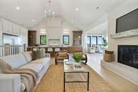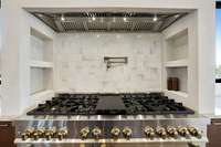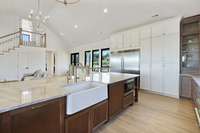 Every inch of this home was professionally designed with luxury in mind, showcasing high- end cabinetry, designer lighting, custom tile, and premium plumbing fixtures. The chef’s kitchen impresses with Taj Mahal quartzite countertops, custom cabinetry, vaulted ceilings, a handcrafted hood, a 60- inch professional range, and a matching 60- inch refrigerator.
