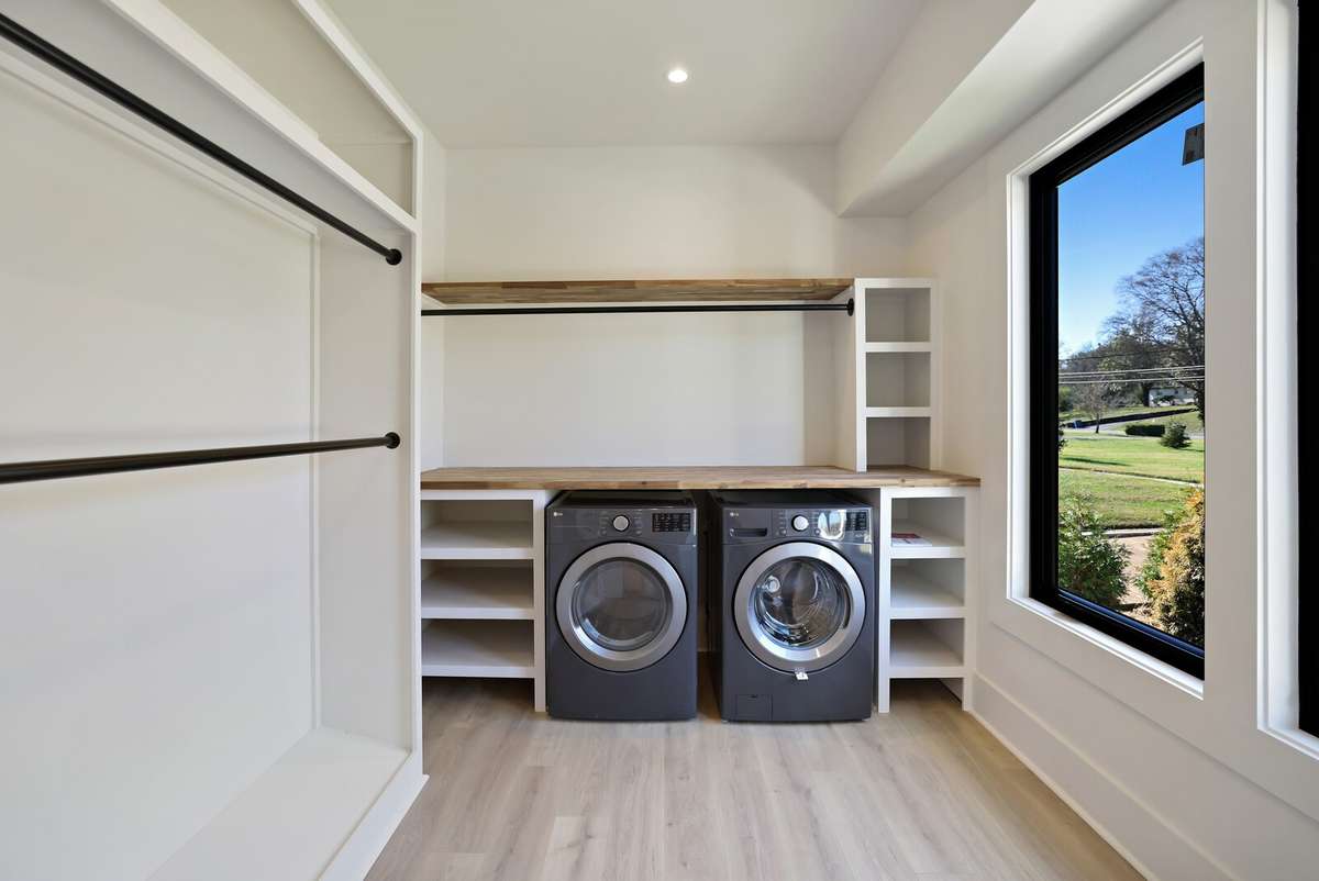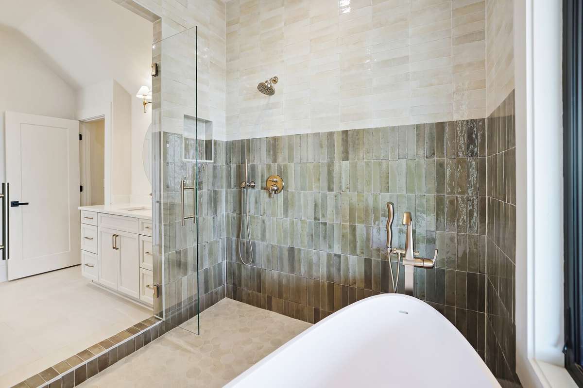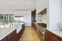 Every inch of this home was professionally designed with luxury in mind, showcasing high- end cabinetry, designer lighting, custom tile, and premium plumbing fixtures. The chef’s kitchen impresses with Taj Mahal quartzite countertops, custom cabinetry, vaulted ceilings, a handcrafted hood, a 60- inch professional range, and a matching 60- inch refrigerator.