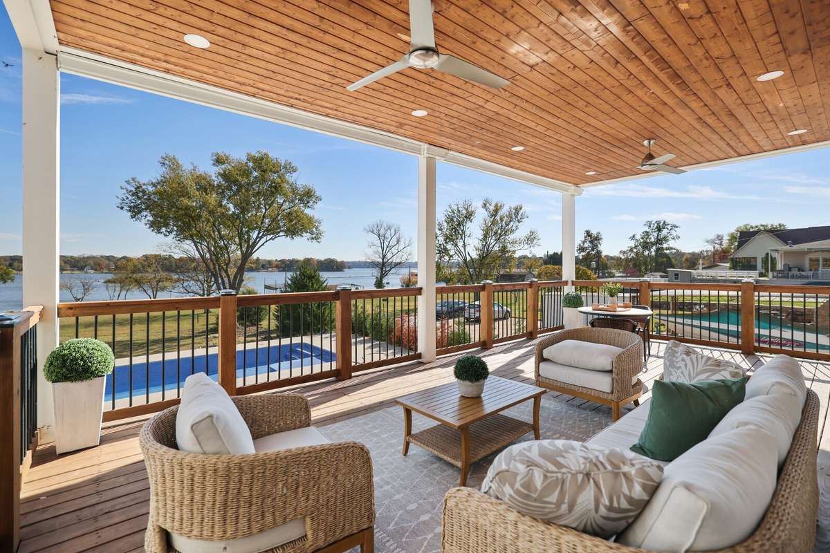 Both primary suites include spa- inspired bathrooms, walk- in closets, and private balconies overlooking the water. The walkout basement offers a full kitchenette, wet bar, gas fireplace, and seamless access to the in- ground pool that overlooks the lake—perfect for entertaining or relaxing with guests.