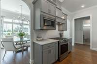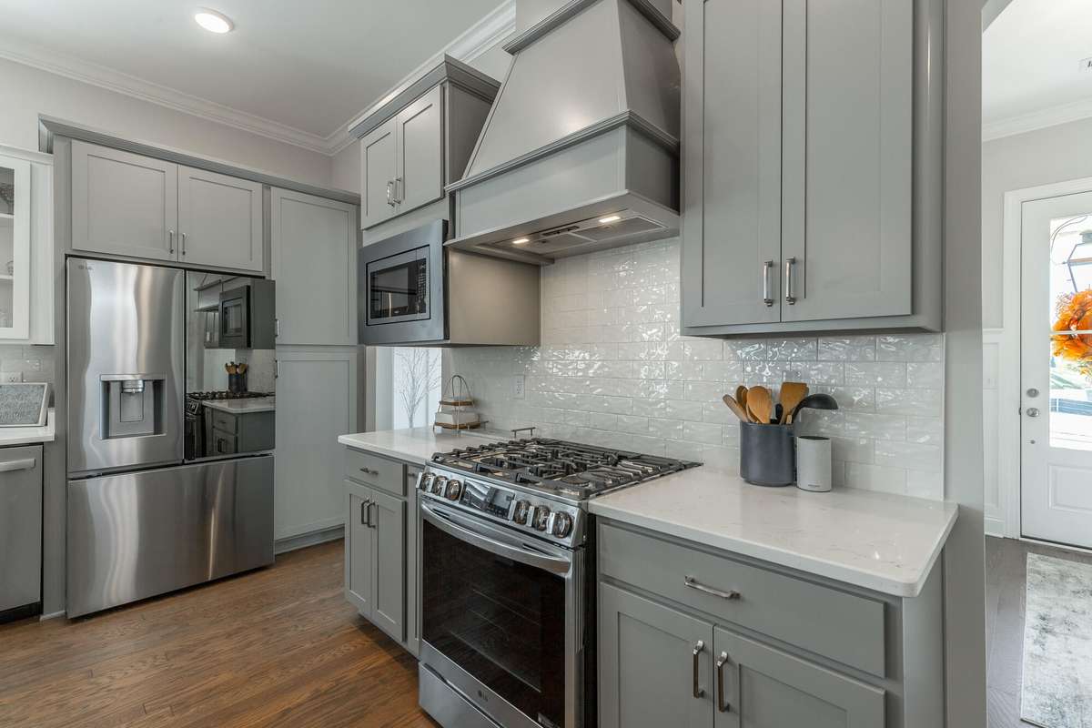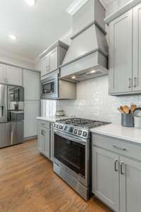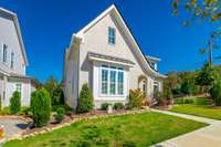 . The charming exterior sets this tone a part from others in the neighborhood — a gas lantern glows beneath an arched front porch, leading to an impressive 8- foot entry door. Inside, 10- foot ceilings create a bright, airy feel, while the foyer opens gracefully with arched transitions to both the dining/ flex room and the main living area.