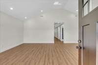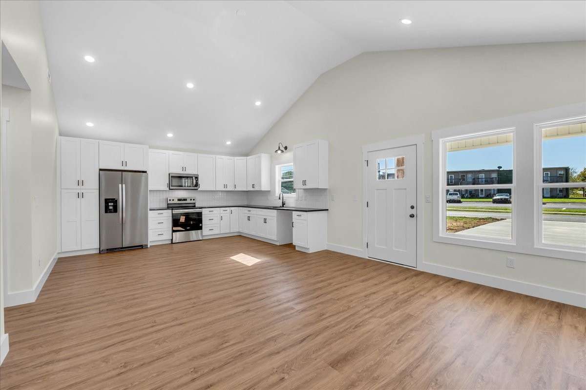 Step inside to find vaulted ceilings that create an open and airy feel throughout the living area. The kitchen features sleek black granite countertops, a white subway tile backsplash, and high- quality cabinetry — the perfect space for cooking and entertaining. Both bathrooms also feature matching granite surfaces, adding a cohesive, polished look.