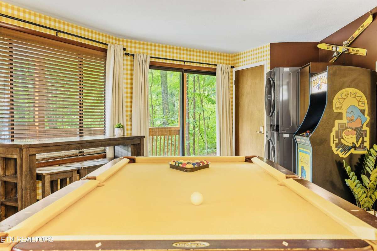 The fun continues downstairs in the game room, where guests can enjoy a custom Eggo- yellow pool table, board games, and additional lounge space. Step outside to the spacious wraparound deck, soak in the hot tub under the stars, or gather around the firepit to enjoy the peaceful mountain surroundings.