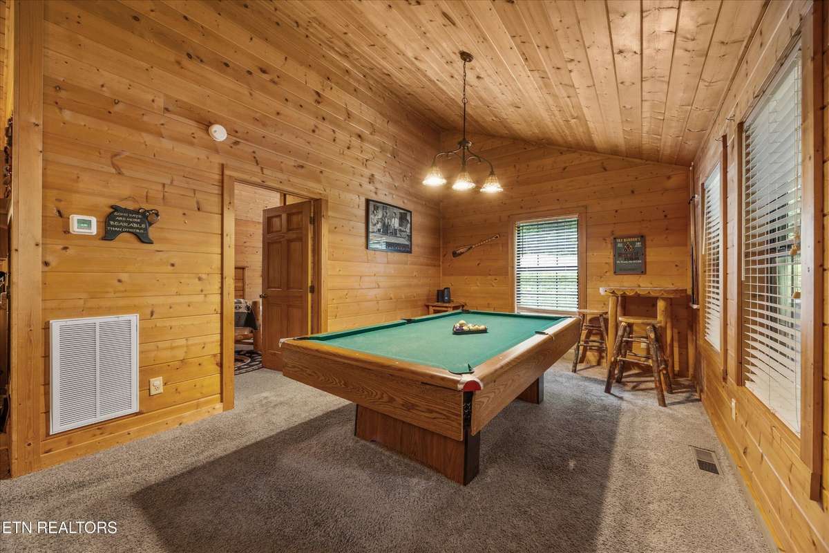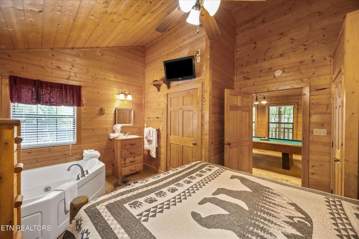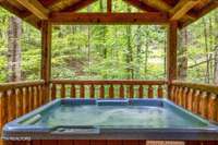 Perfect for couples and honeymooners, this cozy getaway is filled with personality. Challenge your sweetheart to a game of pool with the ' Rat Pack' looking on from their spot above the table — it' s a playful touch that guests adore. Out back, the private deck is all about relaxation, featuring a bubbling hot tub surrounded by nothing but peaceful wooded views.