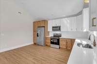 Step inside to find vaulted ceilings that create an open, airy feel. The kitchen and bathrooms feature sleek quartz countertops, white subway tile backsplash, modern two- tone cabinets, and elegant gold hardware for a touch of luxury. The primary suite includes a private shower, offering a comfortable retreat.
