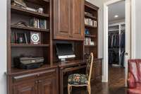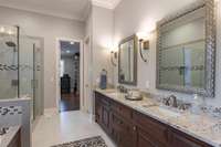 The private primary wing is a true retreat, offering two spacious walk- in closets, a spa- style bathroom, direct access to the outdoor living area, and an adjacent flex room ideal for an office, den, or even a nursery. The opposite wing includes two large en- suite bedrooms, each with walk- in closets, ensuring comfort for guests or family.