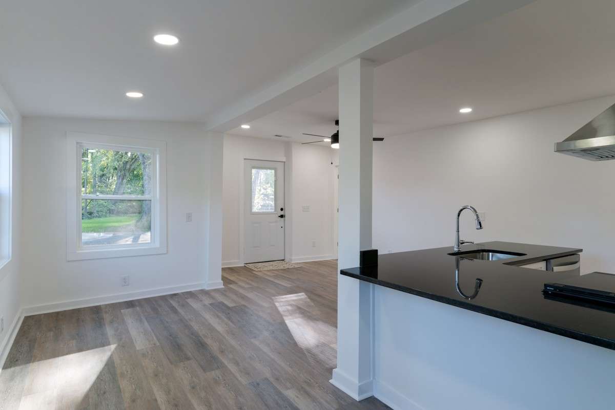 Welcome to this beautifully renovated 3- bedroom, 2- bathroom home combining classic charm with modern comfort. Built in 1945 and recently renovated from top to bottom, this single- level 917 sq. ft. home has been thoughtfully designed to maximize every inch of space for comfortable, efficient living. The open- concept layout creates a bright, airy feel, complemented by neutral luxury vinyl plank flooring that flows seamlessly throughout. The modern eat- in kitchen features striking black granite countertops, crisp white cabinets with black hardware, a sleek black backsplash, and stainless steel appliances, including a vented hood over the range. A counter overhang provides additional dining space, perfect for casual meals or entertaining.