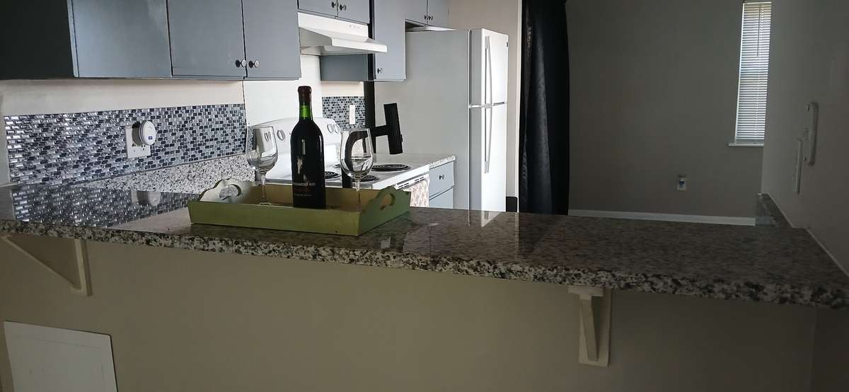New granite counter tops on bar and kitchen area.