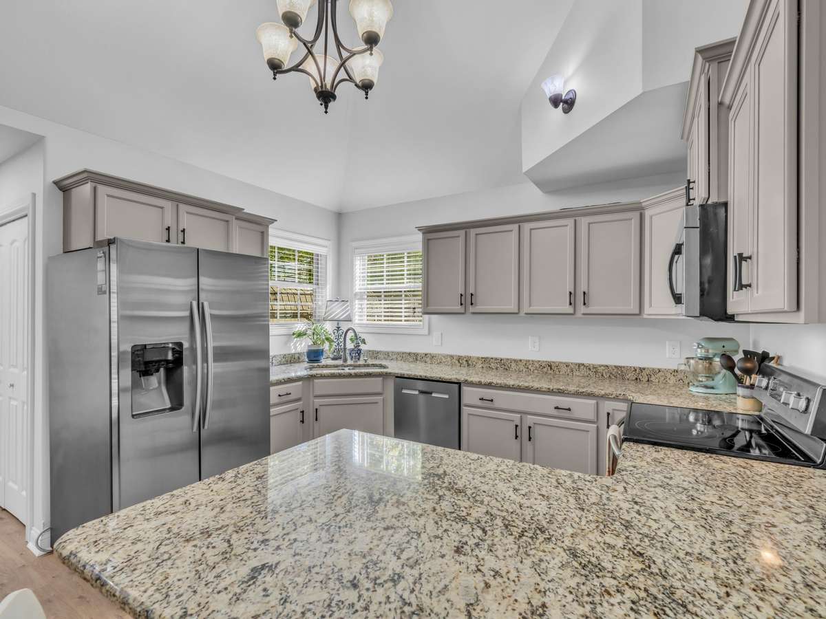 Step inside this inviting home featuring a vaulted great room with a stunning stone fireplace and an open, spacious floor plan that flows seamlessly into the kitchen. The kitchen shines with freshly painted cabinets, granite countertops, and plenty of room for entertaining.