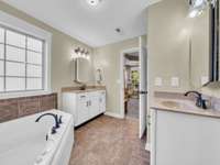 All bedrooms are conveniently located on the main level, with a large bonus room upstairs—perfect for a playroom, office, or media space. The primary suite boasts a tray ceiling and a luxurious bathroom with a ceramic tile shower featuring dual shower heads and dual rain heads, plus a separate whirlpool tub for ultimate relaxation.