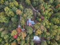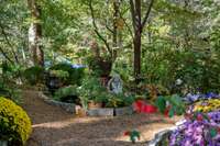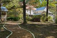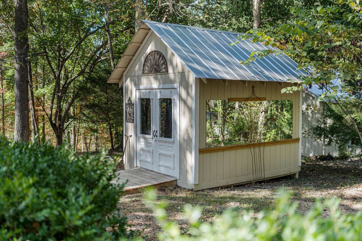 The property also includes a 30' x 46' workshop with roll- up doors, a loft, and a 400- amp panel in both the workshop and home, along with a 240- volt EV plug. An additional hobby room is located near the firepit, while another storage shed with antique doors houses garden equipment. Trails weave through the acreage, one leading down the holler to a picnic table by the creek.