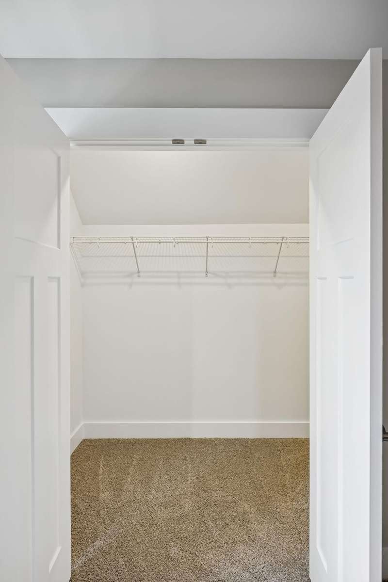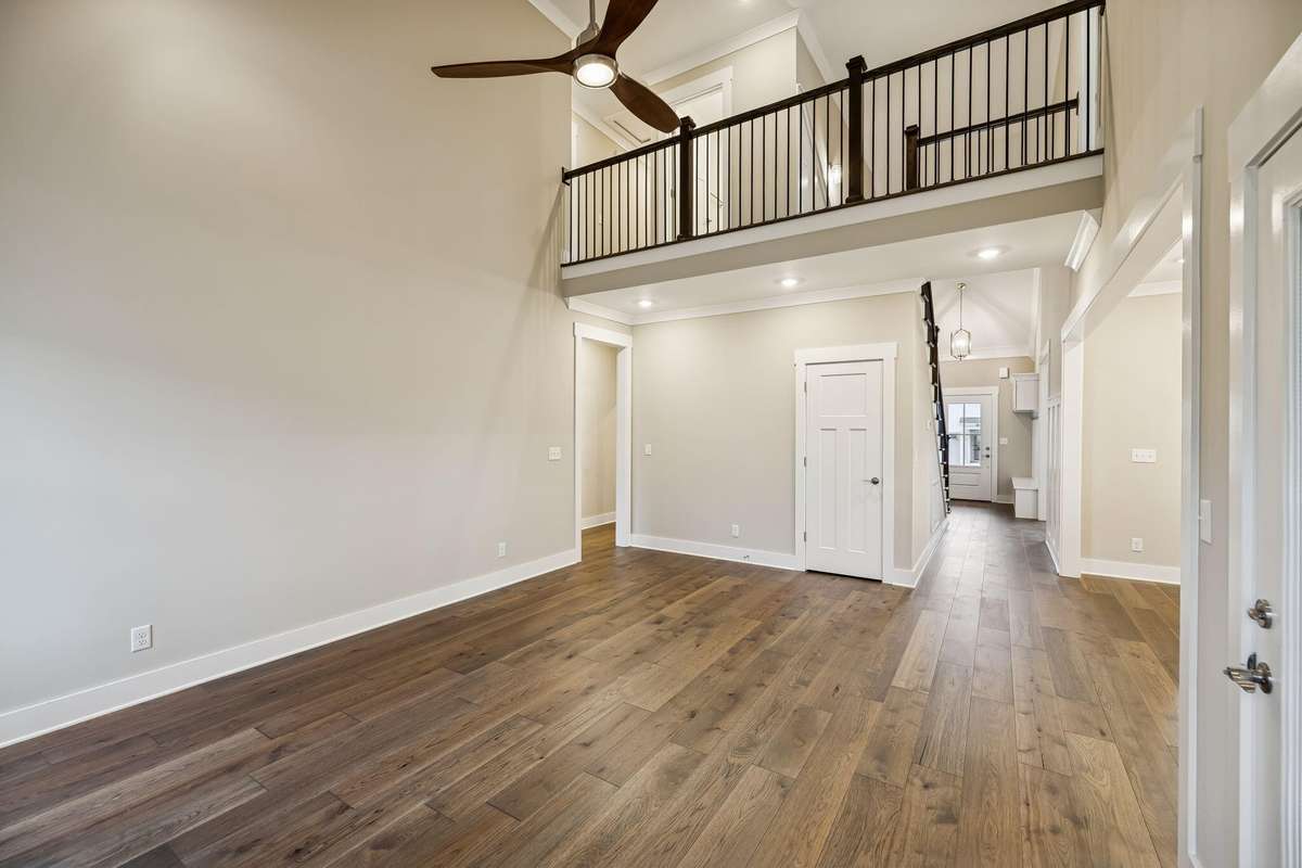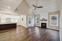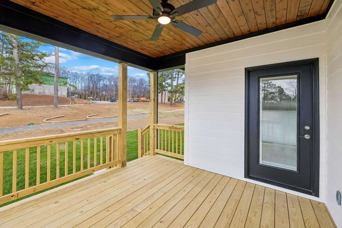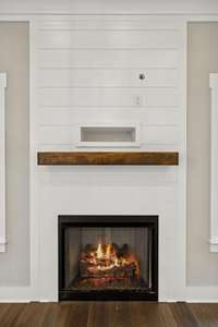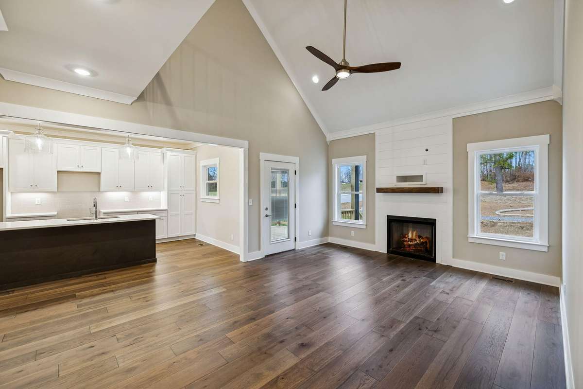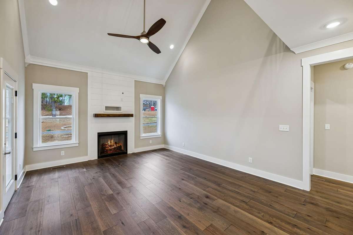 High ceiling in the living room with shiplap fireplace and custom stained wood mantle to decorate. The doorwall to the outdoor living space with a covered deck overlooks direct access to the treed community spaces.