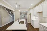 The open kitchen gives an island, breakfast space, tile backsplash, under cabinet lighting, stainless steel built- in appliances and cabinet storage creating a highly efficient workflow that is easy for entertaining.
