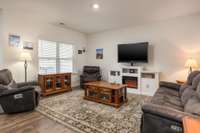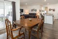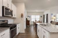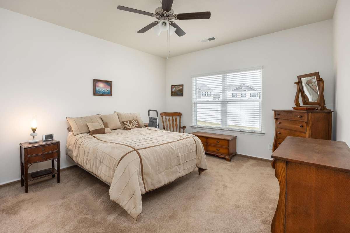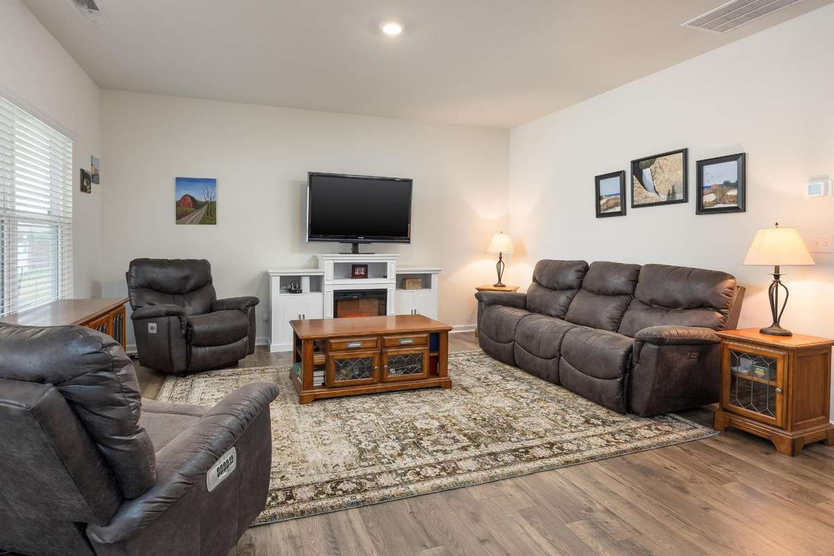 Built in 2022, this beautiful one- level residence offers 3 bedrooms and 2 baths on a spacious corner lot. The open- concept design features high ceilings, granite countertops, and a kitchen with gas stove, bar seating, and a formal dining area- perfect for gatherings. The great room includes an electric fireplace that remains, while the split bedroom floor plan ensures privacy. Enjoy modern conveniences such as a tankless gas water heater, plantation blinds, and pull- down attic storage. All appliances- including the refrigerator, and washer & dryer- stay with the home. Security system and door bell also remain. Step outside to a relaxing patio and take advantage of the double garage for extra storage. Ideally located just minutes from shopping and dining in Cleveland, this home blends comfort, efficiency, and style in one inviting package.