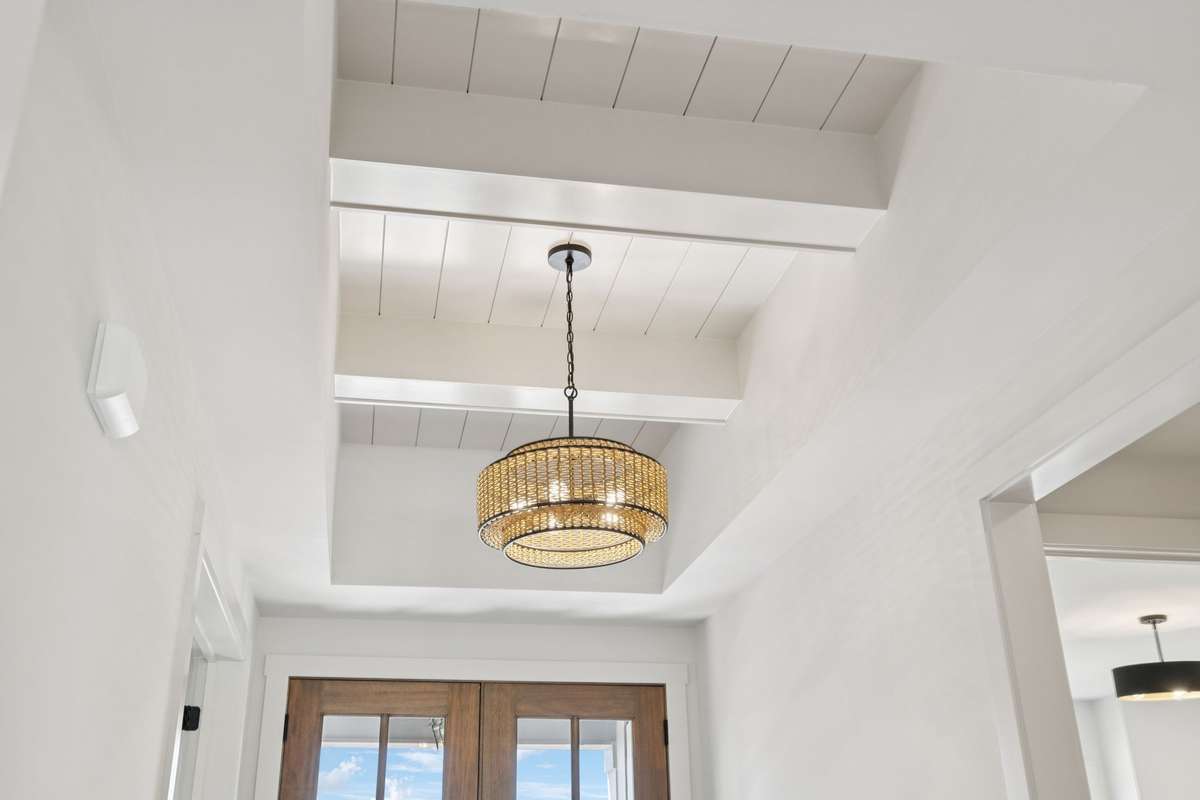 The Primary Suite Features A Vaulted Ceiling With Beams