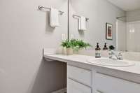 Upstairs, you’ll find two spacious ensuite bedrooms, each with a full bath and walk- in closet—ideal for roommates, guests, or anyone seeking comfort and privacy. A central laundry area adds everyday convenience, and all appliances remain, including the refrigerator, washer, and dryer.