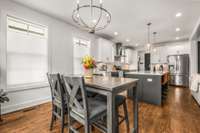 The spacious living room features a cozy fireplace and oversized windows overlooking the large fenced backyard, while French doors open to a serene outdoor space perfect for morning coffee or evening gatherings. The gourmet kitchen is highlighted by quartz countertops, a large island with bar seating, stainless steel appliances, and stylish pendant lighting. Adjacent is a sunlit dining area framed by picture windows that bring the outdoors in.