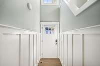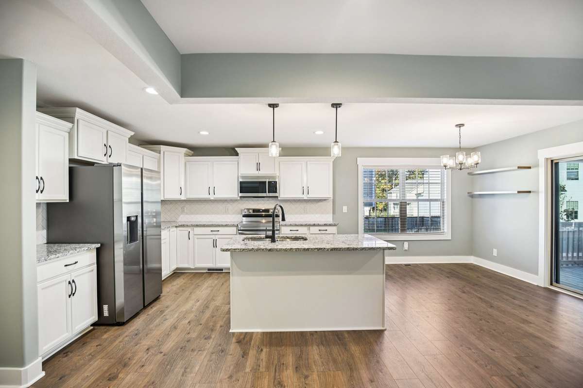 The great room flows into the stunning kitchen featuring a granite island with casual seating, stainless steel appliances, and bright white soft- close cabinets with modern black hardware and a subway tile backsplash. The casual dining area opens to a covered deck overlooking the fenced backyard with no rear neighbors—perfect for privacy! A large pantry, built- in drop zone, and a powder room complete the main floor.
