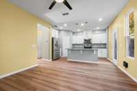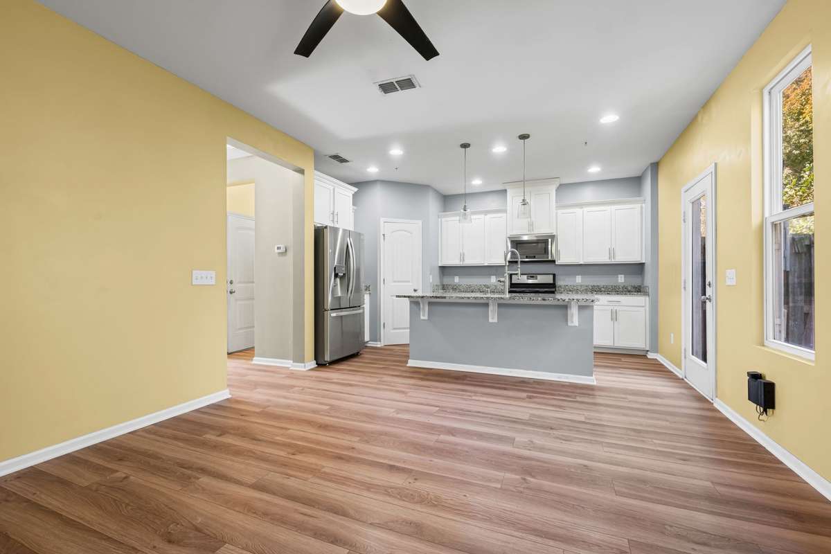 Step inside to find new flooring on the main level and an open- concept design that blends comfort with functionality. The spacious kitchen features a large island with granite countertops, stainless steel appliances, and a generous pantry—perfect for those who love to cook and entertain. The designated dining room offers flexibility and was previously used as a separate living room, allowing you to tailor the space to your lifestyle needs. Abundant natural light fills the home, creating a warm and inviting atmosphere.