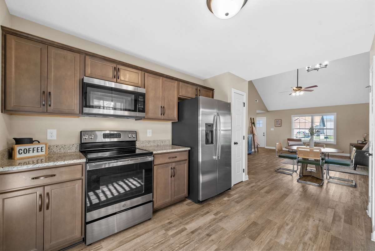 inviting open layout designed for modern living. The kitchen stands out with two spacious pantries, ample cabinetry, and generous counter space topped with beautiful granite countertops.