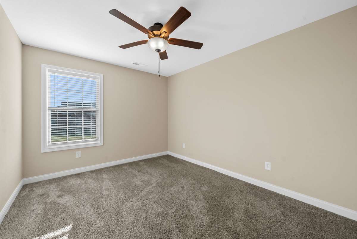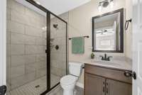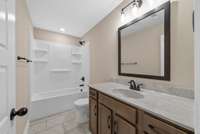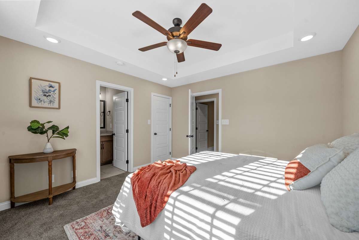 The primary suite is a relaxing retreat with a tray ceiling, a large walk- in closet, and a private bath featuring a tiled shower. Two guest bedrooms are comfortably sized and share a second full bathroom, perfect for family or visitors.