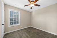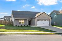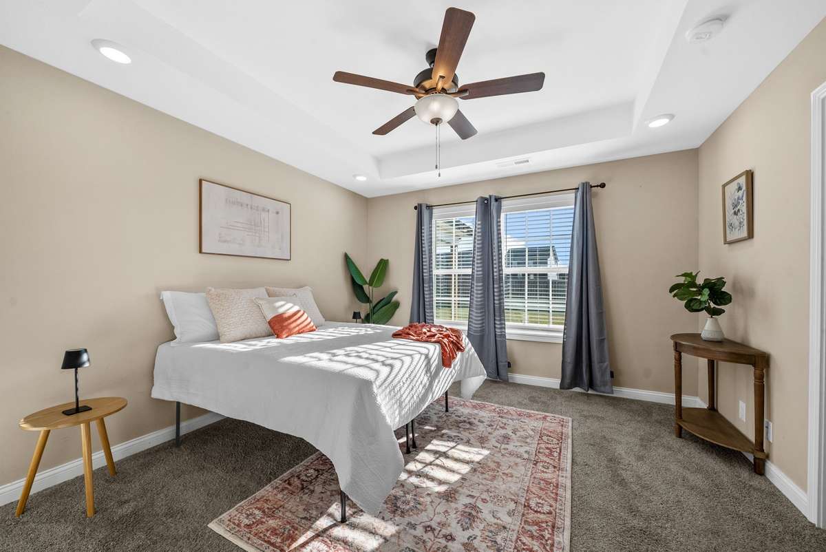 The primary suite is a relaxing retreat with a tray ceiling, a large walk- in closet, and a private bath featuring a tiled shower. Two guest bedrooms are comfortably sized and share a second full bathroom, perfect for family or visitors.