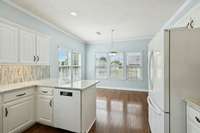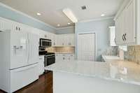 The main level also boasts a large living room with gleaming hardwood floors and a light- filled Florida room with gorgeous tile and an abundance of windows — perfect for relaxing or entertaining. The renovated kitchen is a chef’s dream with quartz countertops, a gas stove, new stainless appliances, a stylish tile backsplash, and a pantry.
