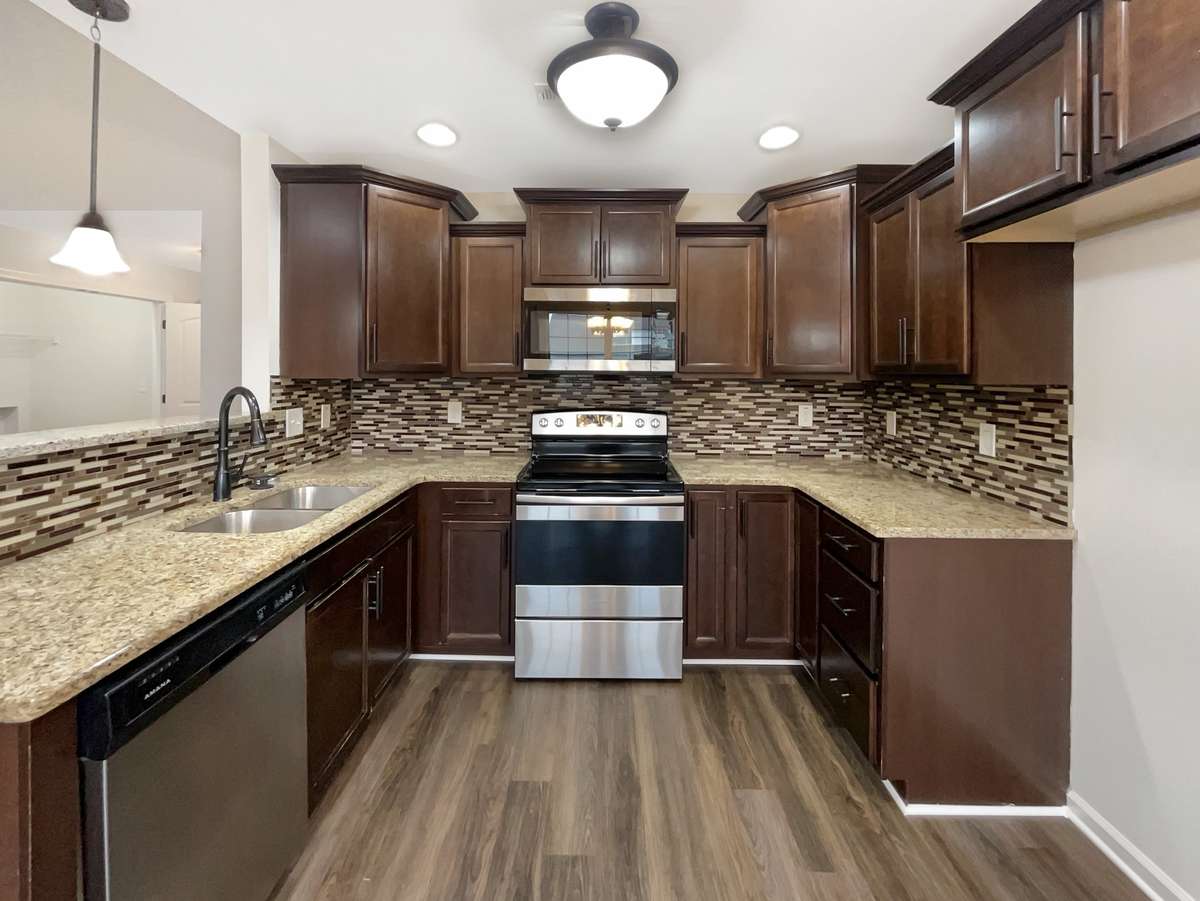 Beautiful home featuring a kitchen with granite countertops, tile backsplash, and