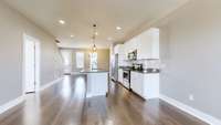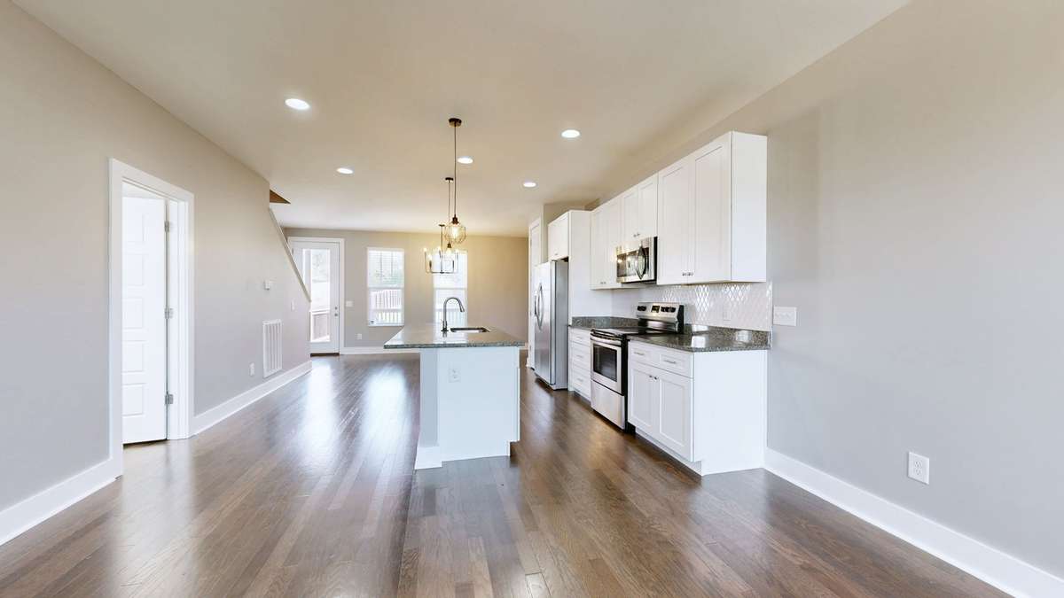 The chef’s kitchen features granite countertops, a large center island, stainless- steel appliances, shaker- style cabinets, and ample storage—perfect for both everyday living and entertaining. The adjoining dining and living areas flow seamlessly to the private back deck, ideal for relaxing or hosting gatherings.