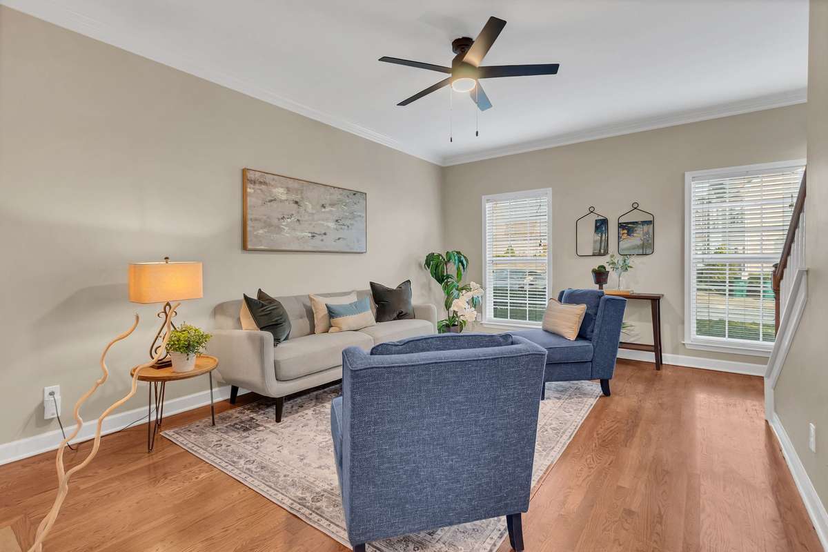 The kitchen features white cabinets, hardwood flooring, and stainless appliances.