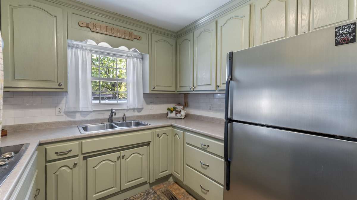 Galley kitchen with deep pot drawers, lazy susan in corner and all kitchen appliances.