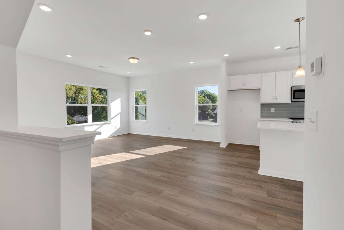 The Radcliffe by Smith Douglas Homes at Sweetbriar Place. The Radcliffe townhome features a modern design with ample windows and a rear- entry garage. The first- floor flex room offers versatility. On the second floor, the main living area boasts an open- concept layout, including a family room at the front, an island kitchen, and a dining area that opens to the balcony. Upstairs, the owner' s suite is situated at the rear for added privacy, separate from the other two bedrooms, and includes a spacious walk- in closet. QUICK MOVE- IN End unit 30