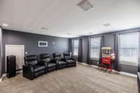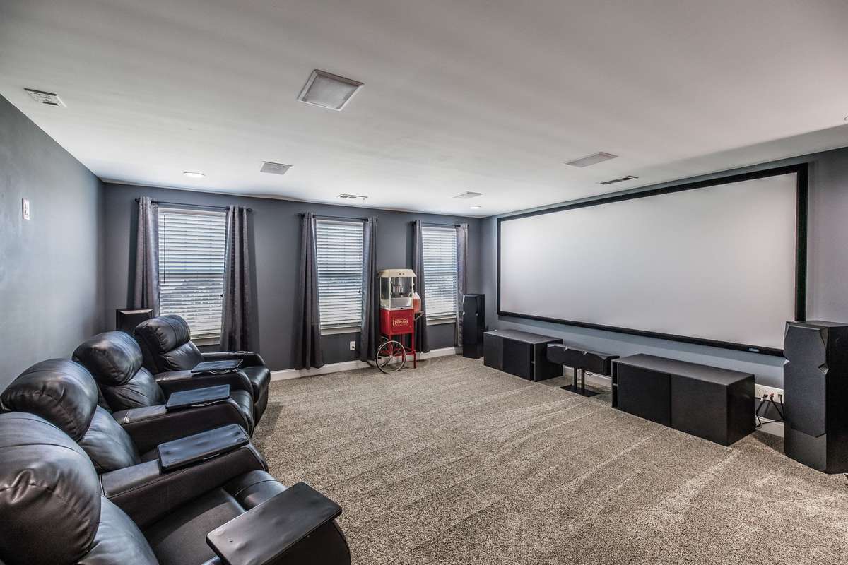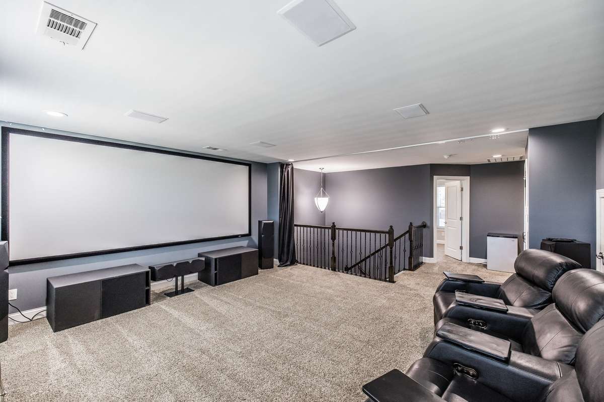 Upstairs, the oversized bonus room has been transformed into a full theater—complete with projector, surround sound, and a large viewing screen.