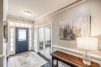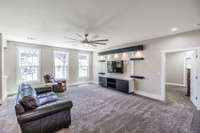 The inviting living room boasts a custom built- in entertainment wall, while a dedicated home office provides the ideal space for remote work or study. The main- level primary suite is a private retreat with tray ceilings, dual walk- in closets, and a spa- inspired ensuite bath featuring a dual- head shower.