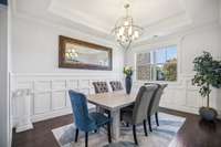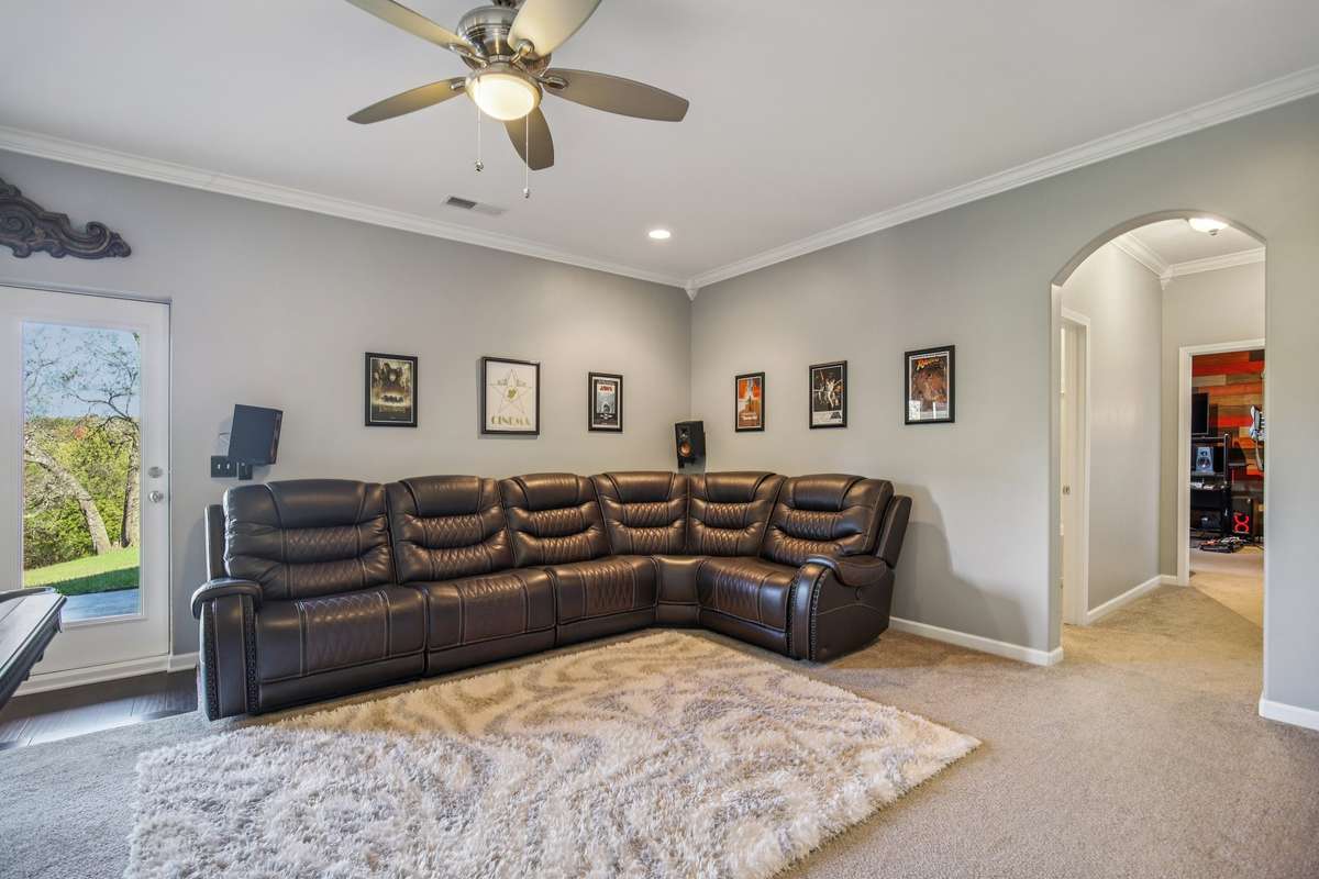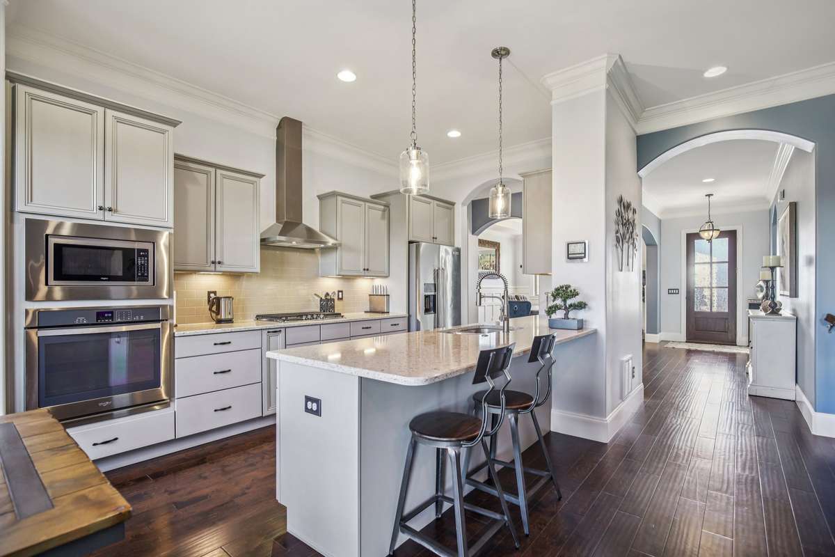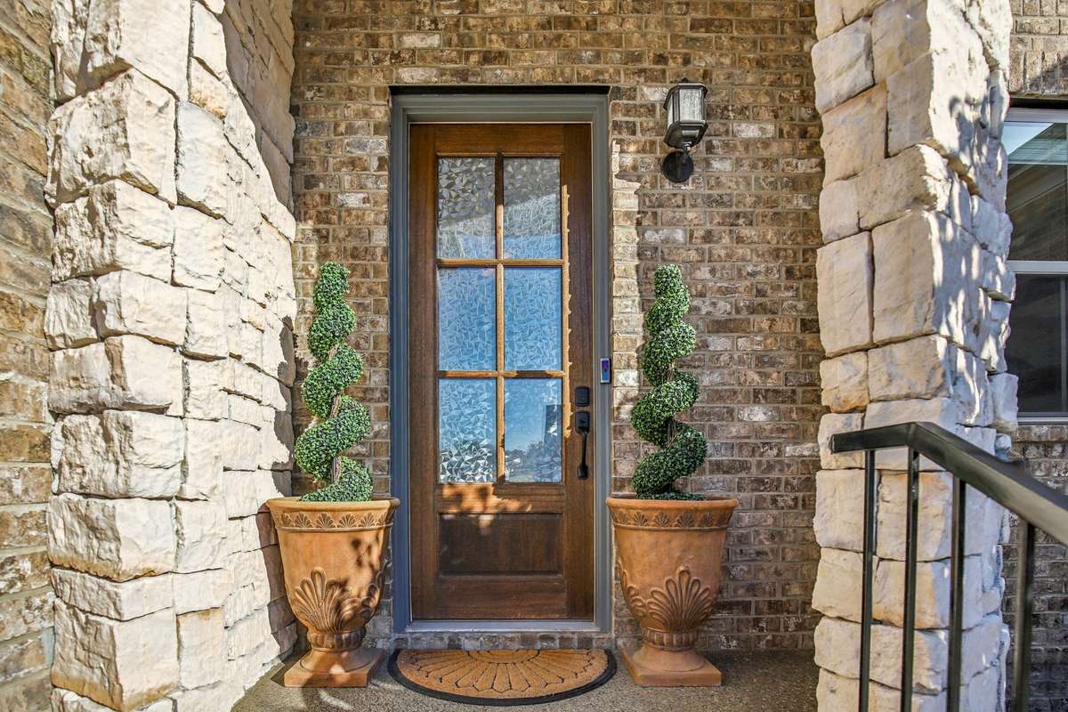 Inside, discover elegant arched hallways, 10- foot ceilings with 8- foot doors, accent walls, crown molding, and wainscoting that add warmth and character throughout. The open- concept layout is perfect for entertaining, highlighted by a stunning stone fireplace and large windows that fill the home with natural light. The gourmet kitchen features granite countertops, stainless steel appliances, and ample cabinetry.