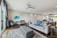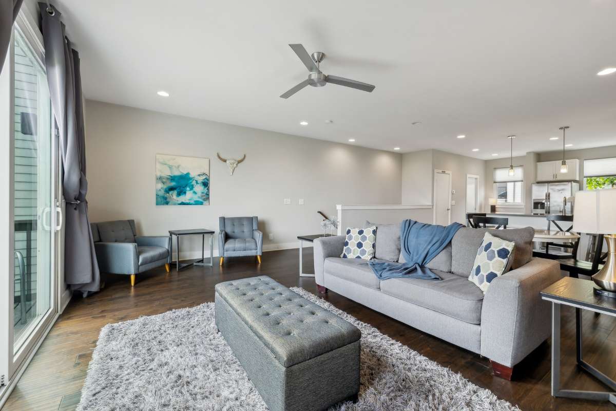 Inside you’ll find quartz countertops, hardwood flooring, tiled baths, and skyline views from both decks. It comfortably sleeps seven or more, with a spacious primary suite, walk- in closet, and open- concept living area designed for flexibility and flow.