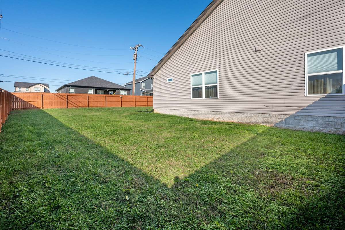 Like- new single- level home with concrete drive and 2- car front- entry garage. Welcoming covered front porch leads into an open floor plan connecting the kitchen, living, and dining areas with a high ceiling in the living room. The kitchen features granite countertops, stainless appliances, rich cabinetry, and center- island seating. The primary suite includes a spacious tile shower and double vanity. Enjoy outdoor living on the covered patio overlooking a large, privacy- fenced backyard. Near entrance for Fort Campbell!