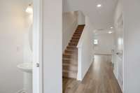 The Braselton II has a arear corner covered patio, directly accessible from the light- filled family room. A large eat- in island kitchen overlooks the family room for easy entertaining. On the second floor, a spacious loft can be optioned to a fourth bedroom and separates the private owner’s suite from two secondary bedrooms. The owner’s suite includes a massive walk- in closet, and private bath, and has easy access to the second- floor laundry room.