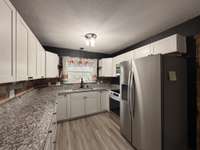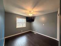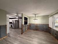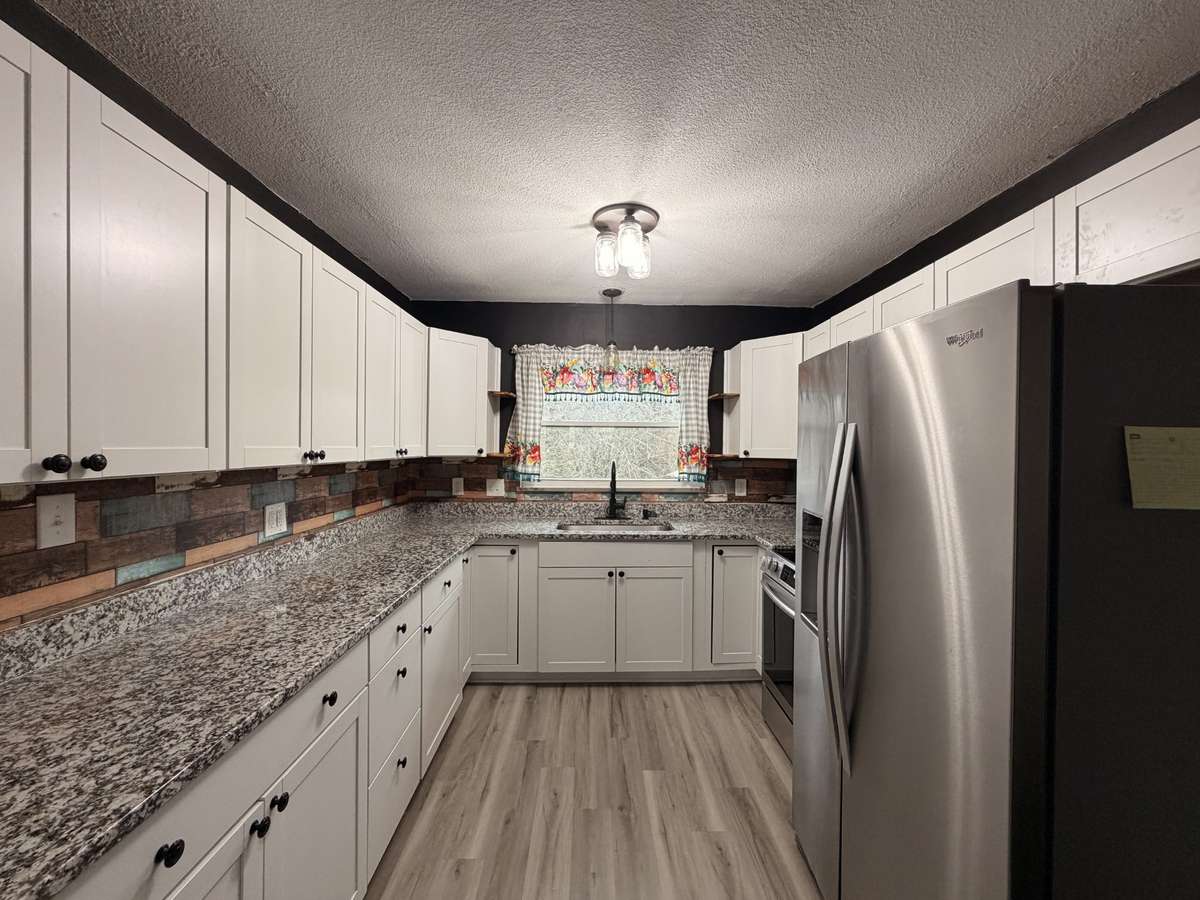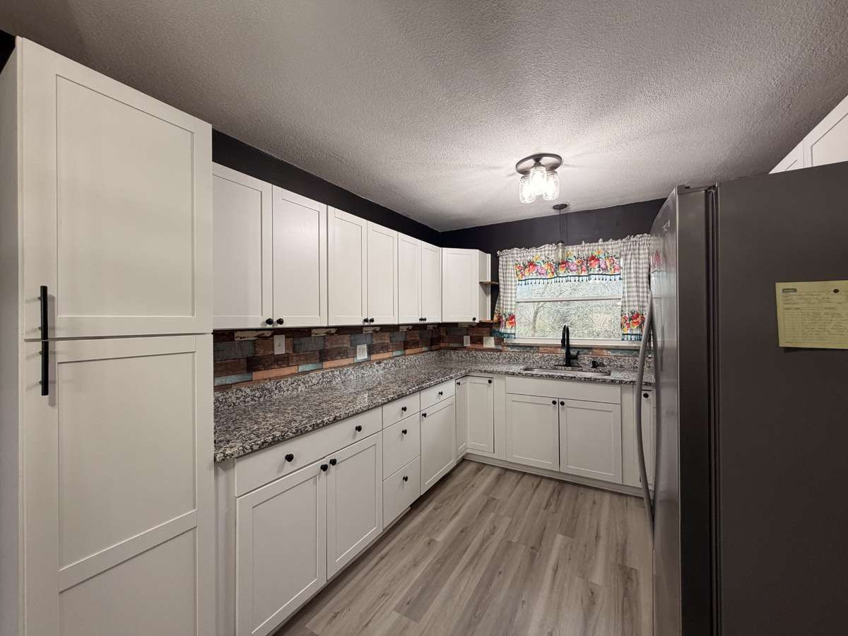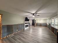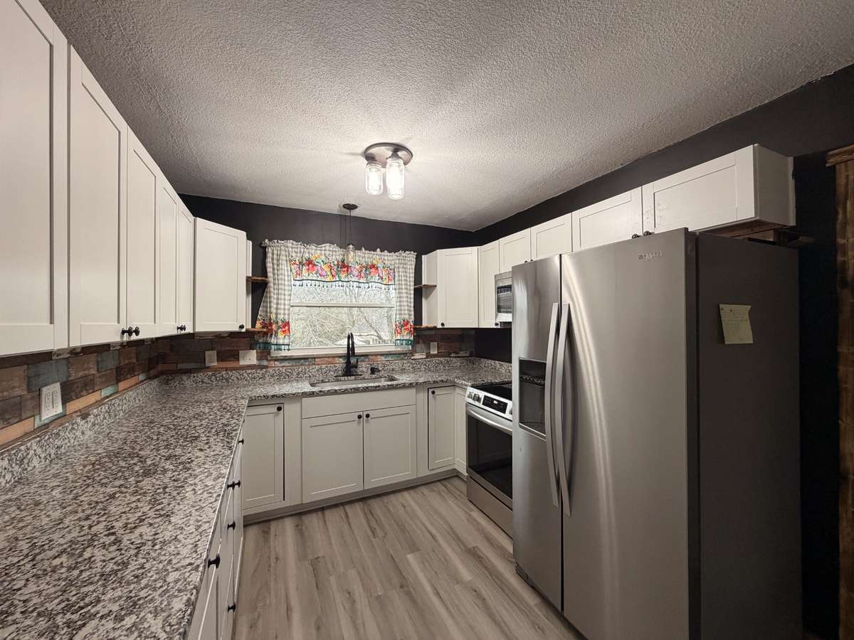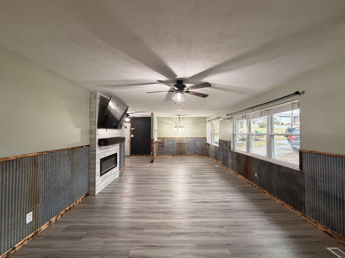 The owners have put real love into this home’s design, blending rustic style with modern comfort. Inside, you’ll find corrugated steel accent walls and hand- burnt custom trim that make the space feel warm and one- of- a- kind. The living room features an electric fireplace with a custom wood mantle, perfect for cozy nights in. Downstairs, a large family room with a wood- burning fireplace is ready for movie nights or game days.
