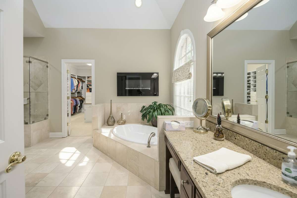The main level offers a formal dining room, formal den, large living room with gas- log fireplace and vaulted ceilings, white oak hardwood and tile floors, and an immaculate kitchen with quartz countertops and solid cherry wood cabinets. A stunning cathedral- ceiling sunroom provides incredible natural light and views.