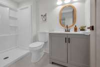 The primary suite is on the main level for convenience and privacy. Inside, you' ll find a spacious walk- in closet and an en suite bathroom with dual vanities, a tiled walk- in shower, and a separate soaking tub. The tile work and fixtures are clean and modern—everything feels thoughtful and intentional.