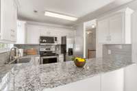 The updated kitchen shines with new granite countertops, a new