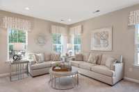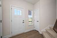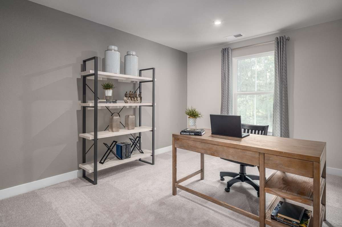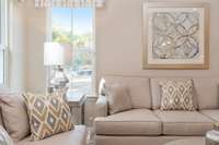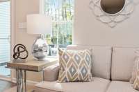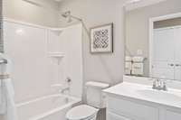 The spacious kitchen features plenty of cabinet space and a wide array of customization options, including quartz countertops, designer backsplash, hardware, cabinets, lighting fixtures, and LVP flooring—so you can personalize your space to reflect your taste. Stainless- steel GE appliances are included for a sleek, modern finish.