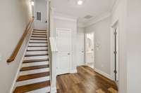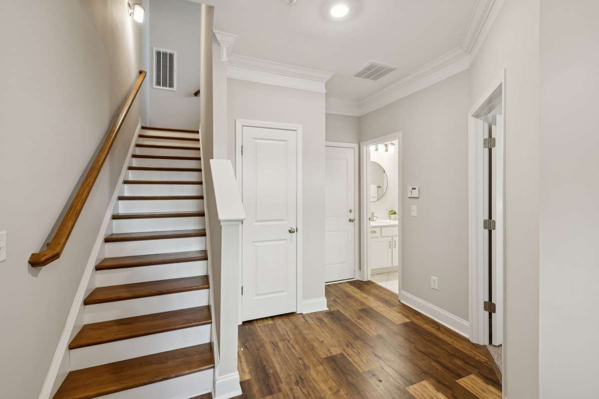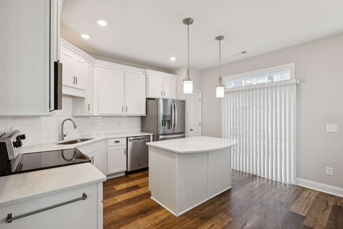 Charming End Unit Townhome with Covered Porch in Burkitt Commons! This light and bright home is filled with natural light from the wall of windows on an end unit floorplan. Open concept living that flows seamlessly between rooms. It is truly move- in ready with new carpet in bedrooms, new paint, deep cleaned, and with the refrigerator and washer & dryer included! ! The first floor features a bedroom and bathroom which could be used as an office. The primary suite features extra windows, trey ceiling, walk- in closet, and the primary bathroom with double vanities and large tile shower. The third bedroom features extra windows, two walk- in closets, and a large en suite bathroom. The eat- in kitchen features white cabinets, quartz counters, subway tile backsplash, stainless steel appliances, pantry, kitchen island for additional seating, and direct access to the back porch for grilling. The large living room has direct access to the covered front porch. LVP flooring is throughout the main areas of the home and upgraded hardwood stairs. A 2 car garage is on the rear of the home. Enjoy the convenience of Burkitt Commons with walkability to several restaurants, shops, and just minutes away from multiple grocery stores. This property is perfect for those wanting low- maintenance living with the convenience to everything the area has to offer. The sellers can close quickly - be in before the holidays!