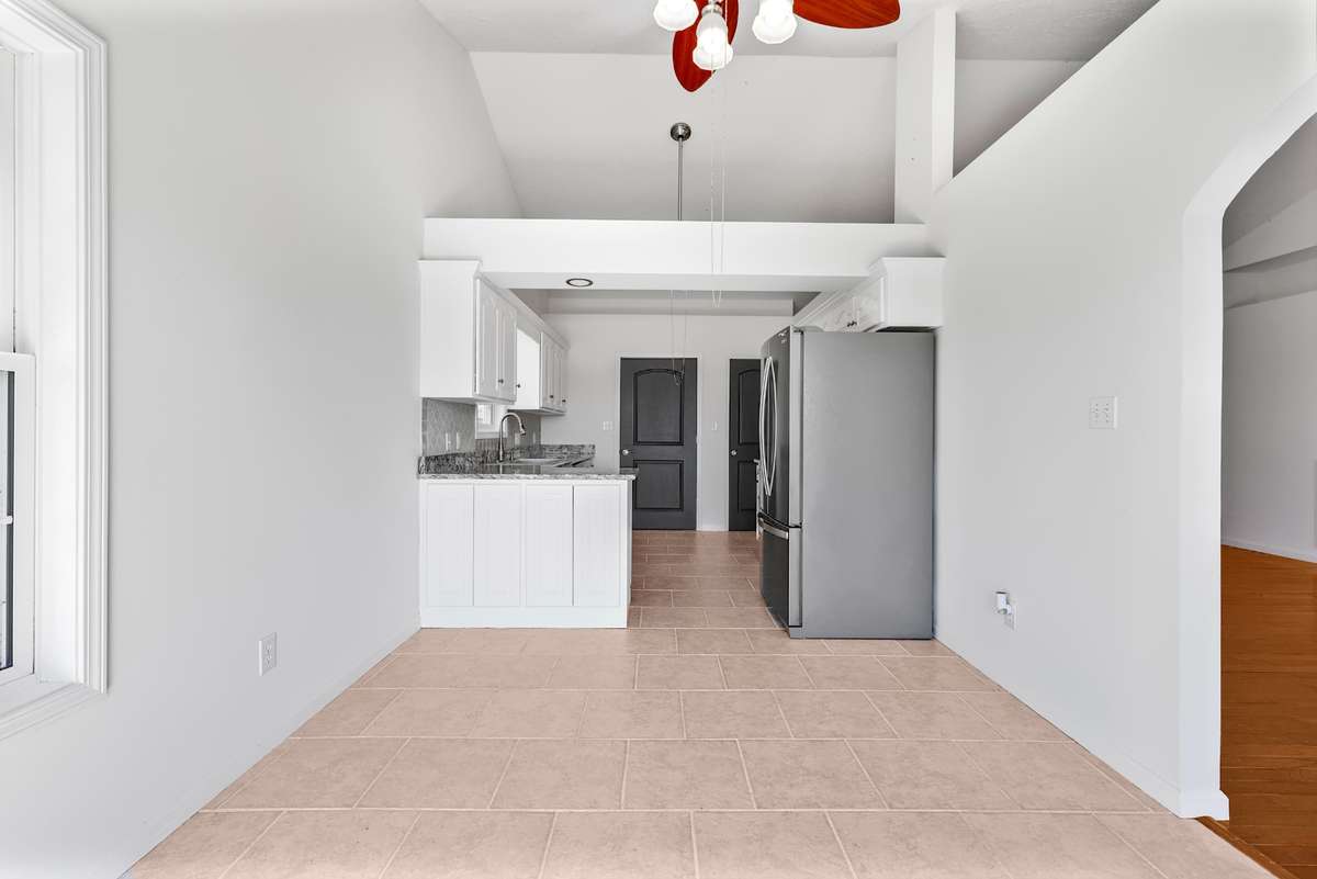 Inside, you’ll love the layout with vaulted ceilings and lake views from nearly every room. The kitchen has freshly painted white cabinets, granite countertops, a farmhouse sink, updated Moen fixtures, and plenty of storage.