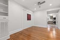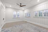 Step inside and you' ll immediately notice the tall ceilings and custom- milled oak flooring that runs throughout. The main level offers a formal living room with a direct- vent gas log fireplace, pantry, a kitchen that is spacious, bright, and designed with function in mind—featuring a second wall oven and microwave, wine and beverage center, deep counters, custom metal range hood, light cabinetry, quartz countertops, and a crackle- glaze tile backsplash. The breakfast bar seats two, and the classic porcelain cast- iron sink.