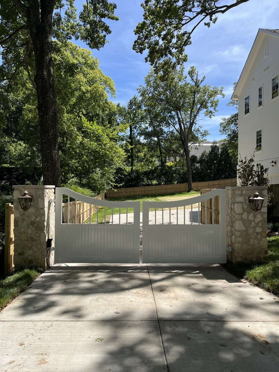 Electric gate with keypad capped off by gorgeous stone pillars adorned with gas lanterns