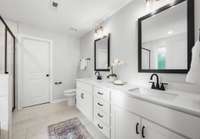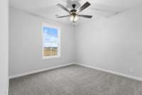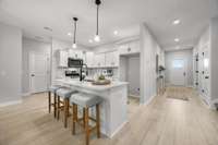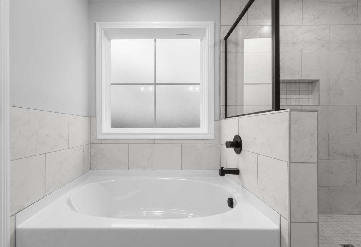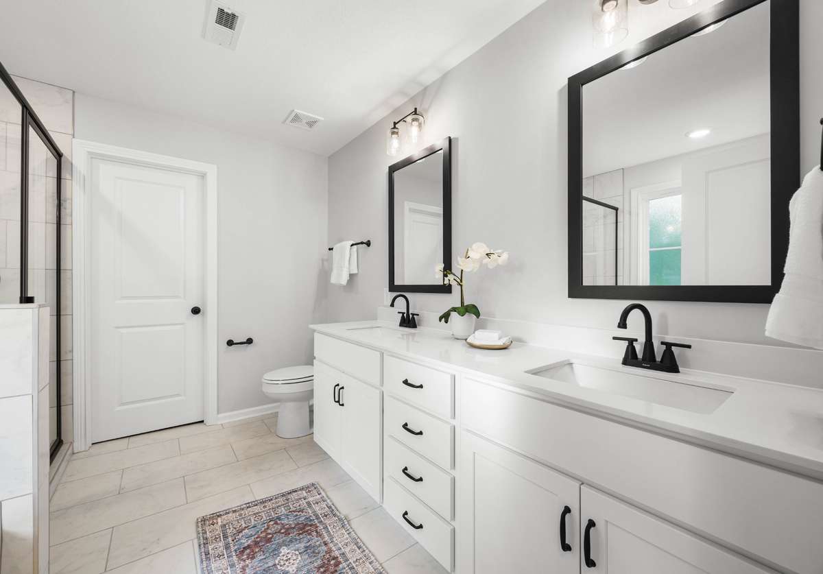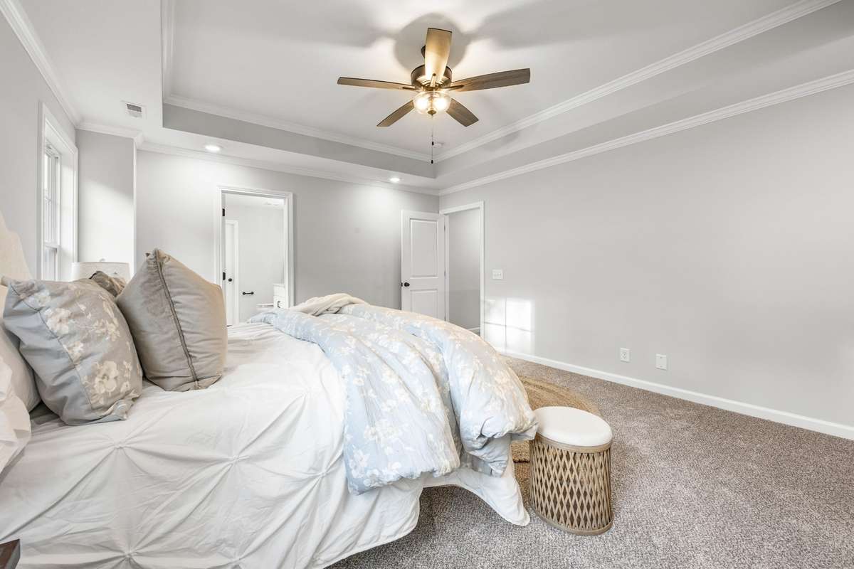 Upstairs, you’ll find all four bedrooms—most with walk- in closets—along with a convenient full laundry room. The luxurious primary suite impresses with a double tray ceiling, an oversized walk- in closet, and a spa- inspired bathroom featuring a floor- to- ceiling tiled shower, a soaking tub, and a dual vanity.